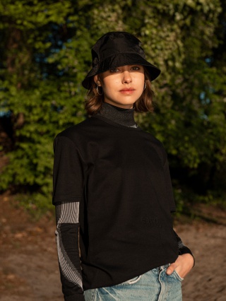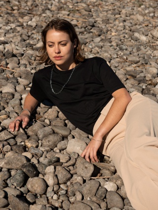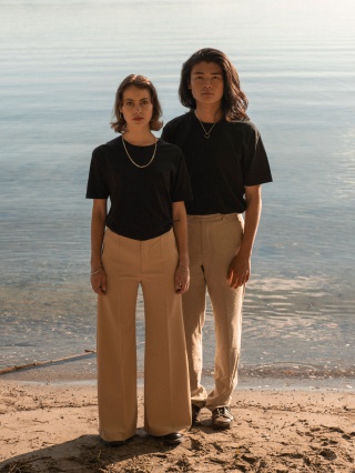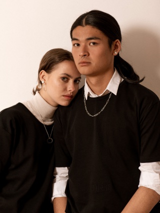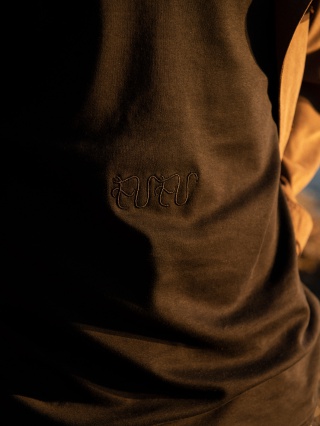 Heavyweight interlock knitted T-shirt with regular short sleeves. Slightly fitted at body and around shoulders, crew neck and inside neck tape. In a soft, heavy knitted quality, made from ringspun combed cotton and embroidery made in Konstanz, Germany.